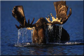 As you drive at twilight, keep an eye on the sides of the road for horse-size animals that might walk in front of you. An adult male (bull) moose can weigh 1,600 pounds and the female (cow) a little less. Only the male has antlers, which fall off in the winter. Males can also be distinguised by their longer "bell" hanging from the lower jaw. Moose calves are born in mid-May. Whatever you do, don't get between a moose (cow) moose and her one or two calves; she will be protective. Even though moose seem cute, like Bullwinkle, they're wild animals and should not be fed or walked up to by well-meaning watchers.